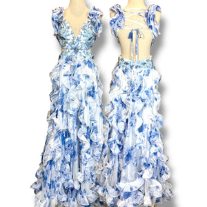 ชุดนี้มาในโทน ขาว–ฟ้าลายดอกไม้ ให้บรรยากาศอ่อนหวานแบบวินเทจ ดีไซน์เด่นด้วย ruffle ชั้นซ้อนตลอดทั้งกระโปรง เพิ่มมิติและความพริ้วไหวอย่างสวยงาม ช่วงอกตกแต่งงานปักและลูกปัดละเอียด เสริมความหรูแบบชุดราตรีพิเศษ ด้านหลังเป็น lace-up back สามารถปรับกระชับตามสรีระได้อย่างลงตัว