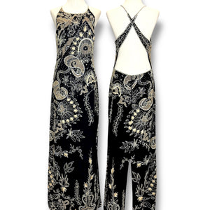 เดรสยาวคอฮอลเตอร์เปิดหลัง โดดเด่นด้วยลวดลายปักสีทองบนผ้ากำมะหยี่สีดำสนิท ลายปักแน่นละเอียดเต็มผืนในลักษณะโบฮีเมียนผสมศิลปะเอเชีย สื่อถึงพลัง ความลึกลับ และความหรูหราในตัวเดียวกัน