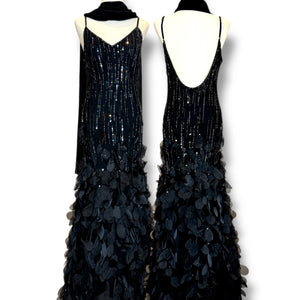 เดรสวินเทจออริจินอลจากแบรนด์ Sue wong ที่ขึ้นชื่อเรื่องงานเลื่อมและงานประกายคุณภาพสูง ชุดนี้มาในโทน ดำลึก Midnight Black ประดับด้วย เลื่อมเรียงแนวตั้งและ applique แบบกลีบ/ใบที่ด้านล่าง ให้ผิวสัมผัสพริ้วเหมือนกลีบดอกไม้ไล่ระดับลงมา สร้างมิติและการเคลื่อนไหวเมื่อเดินดูสวยงามทุกองศา
