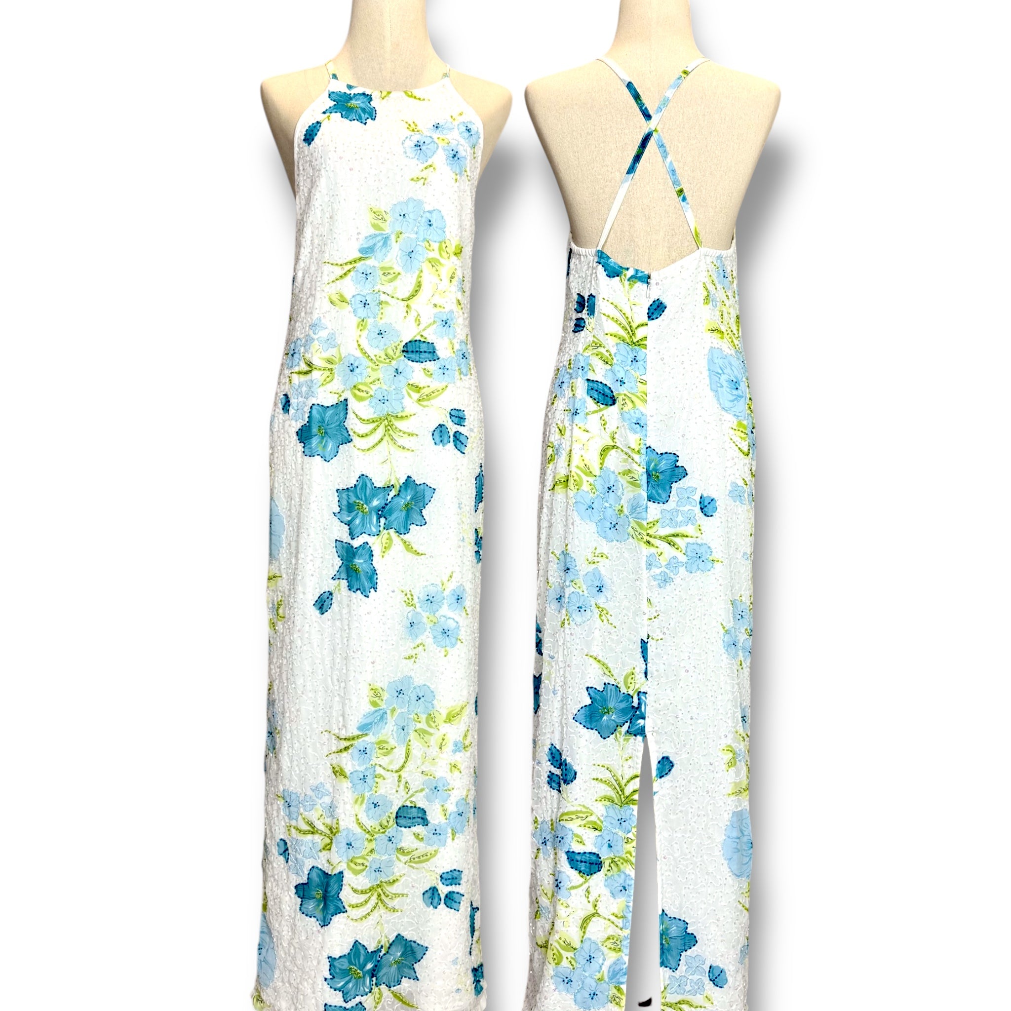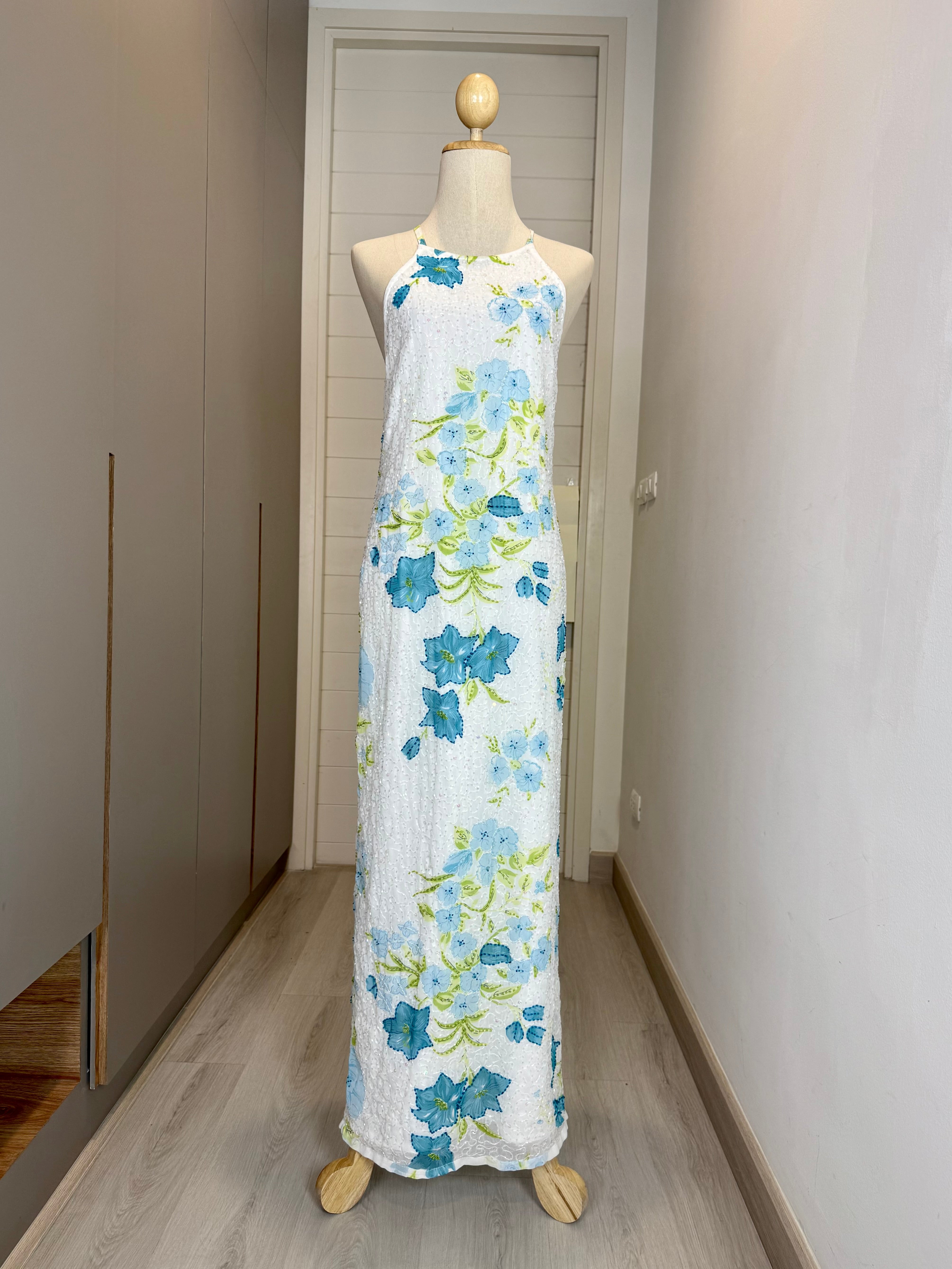 V149 Vintage Blue Bloom Sequin Halter Dress (M)
