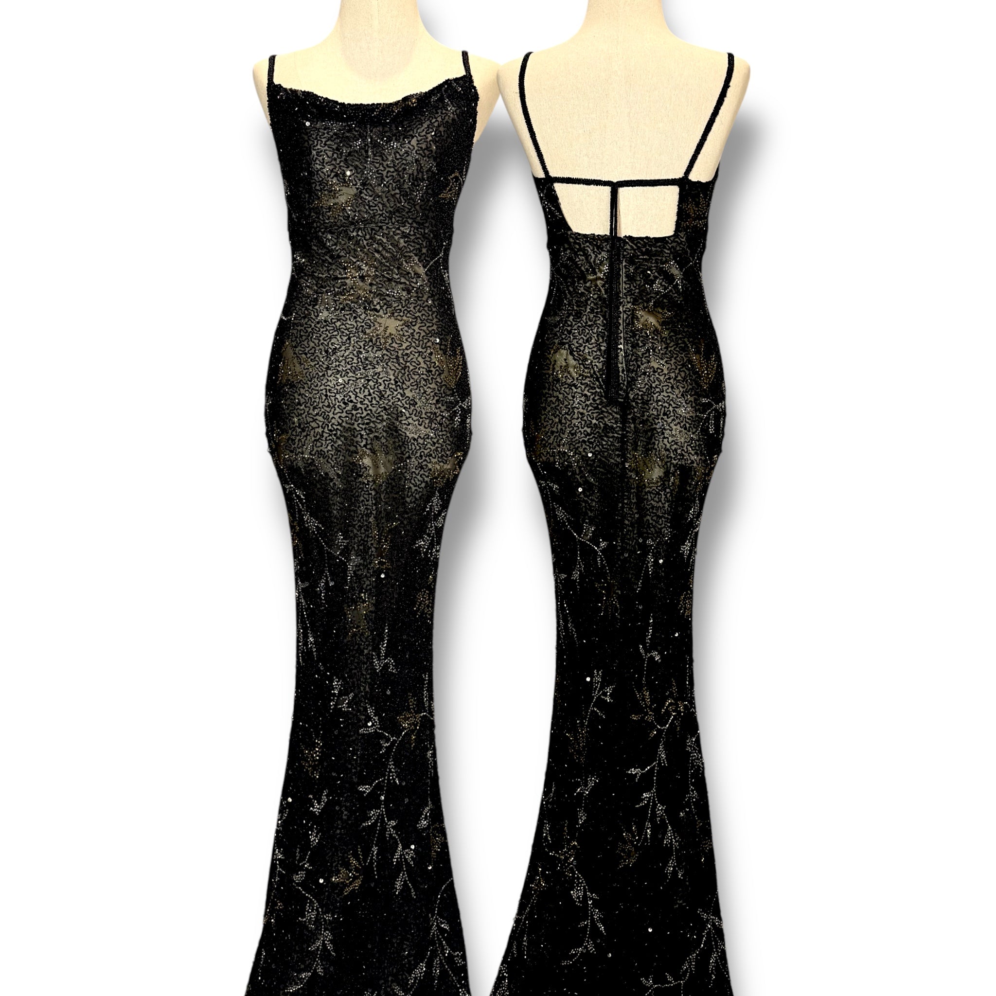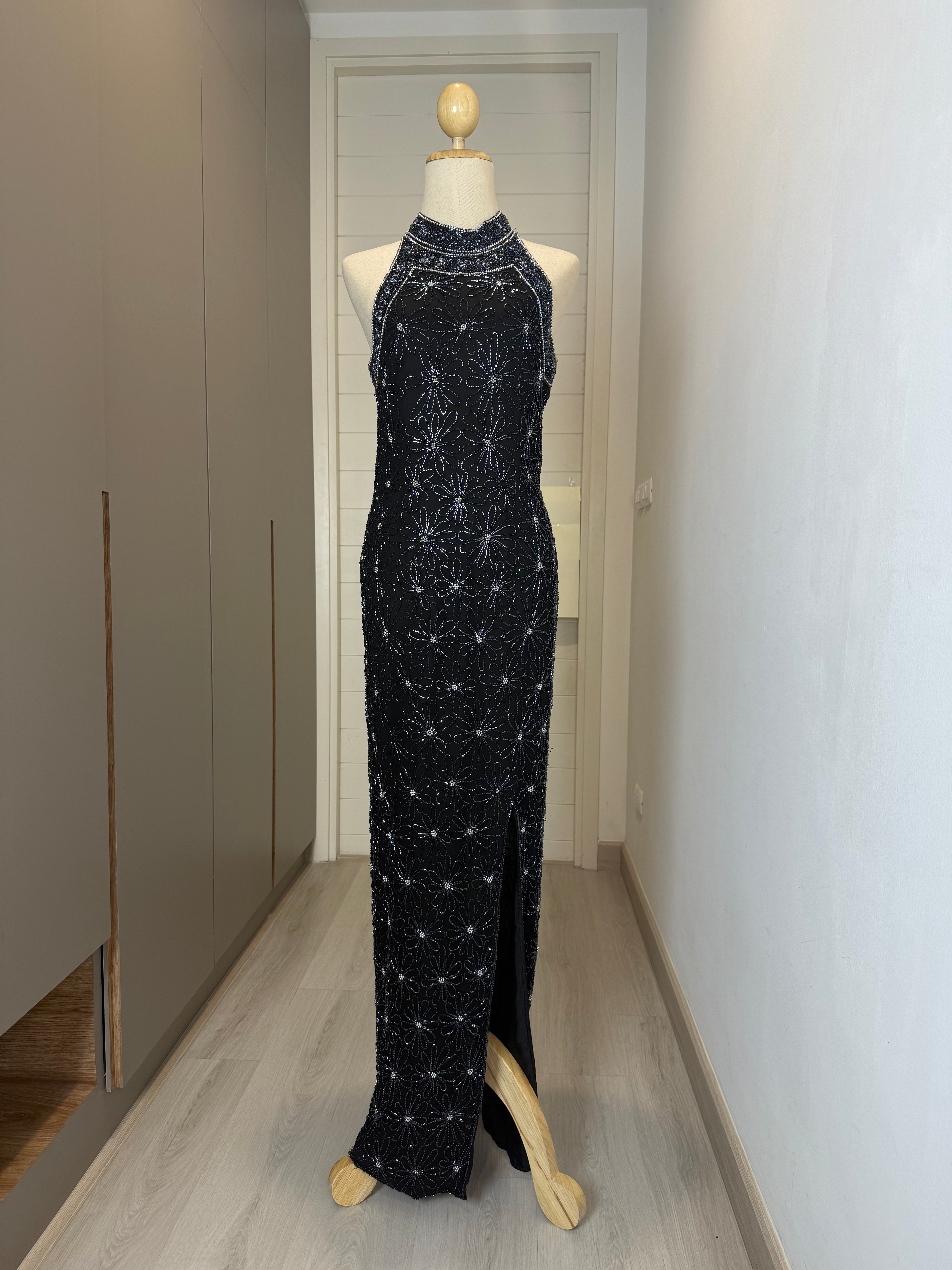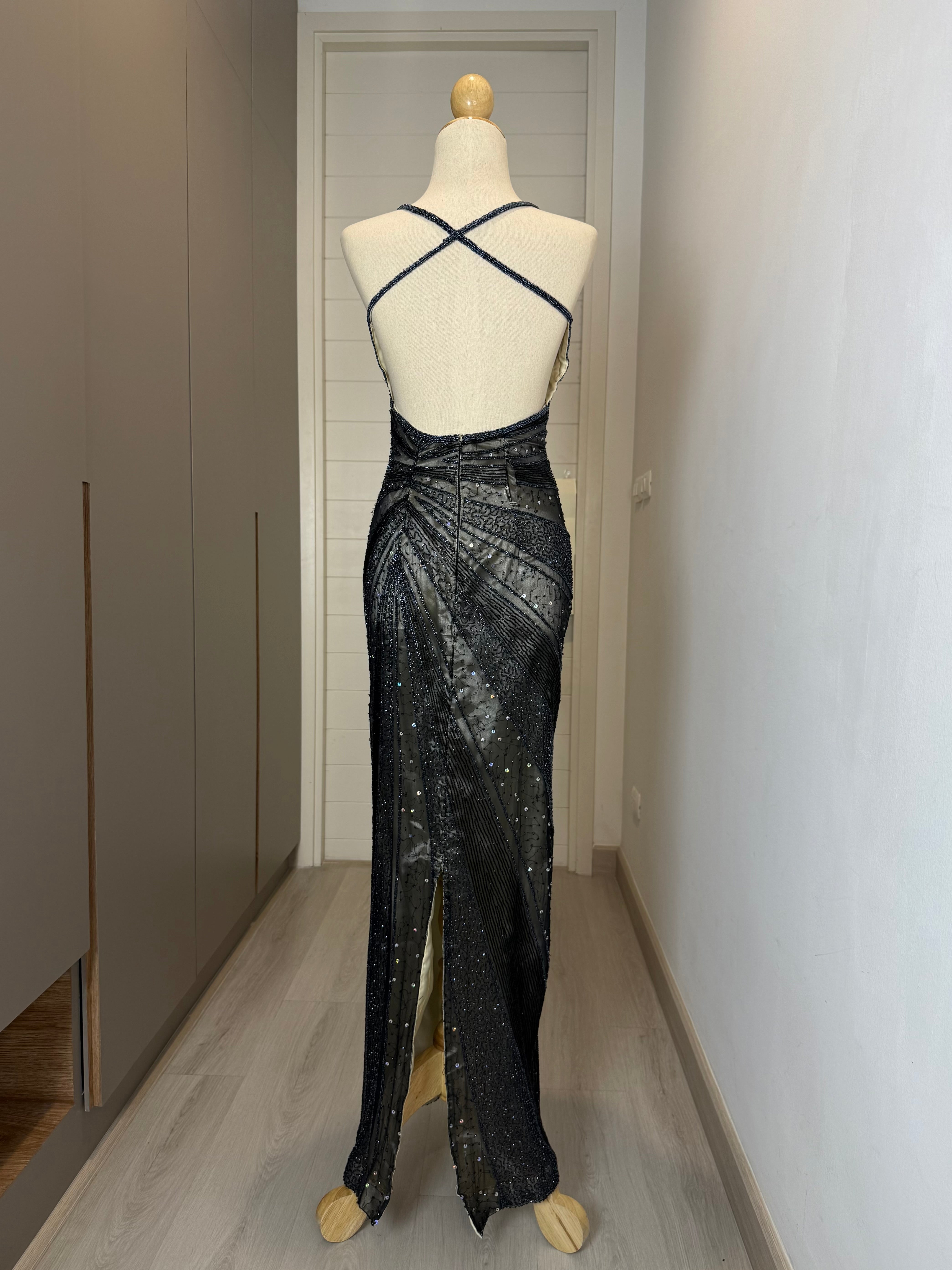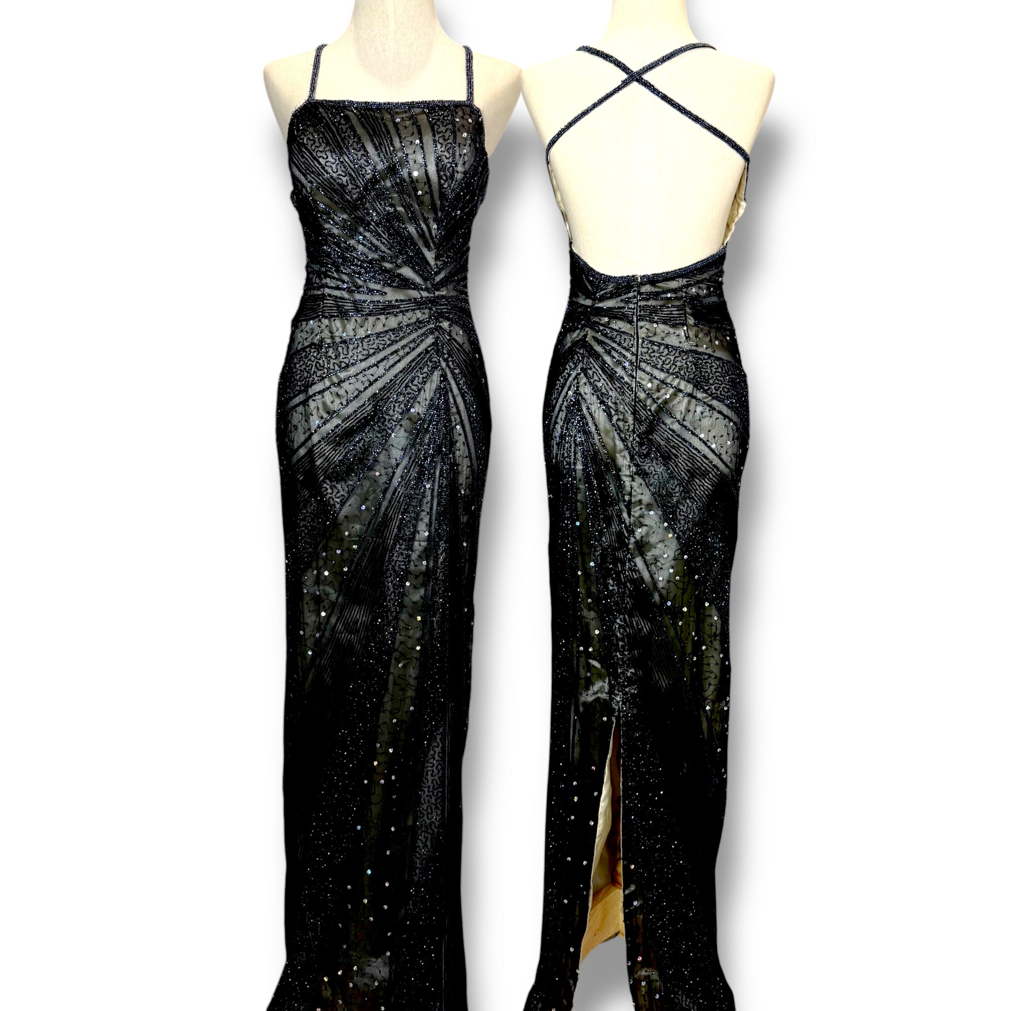 V136 Vintage Black Beaded Gown – Strappy Back Detail (XS)