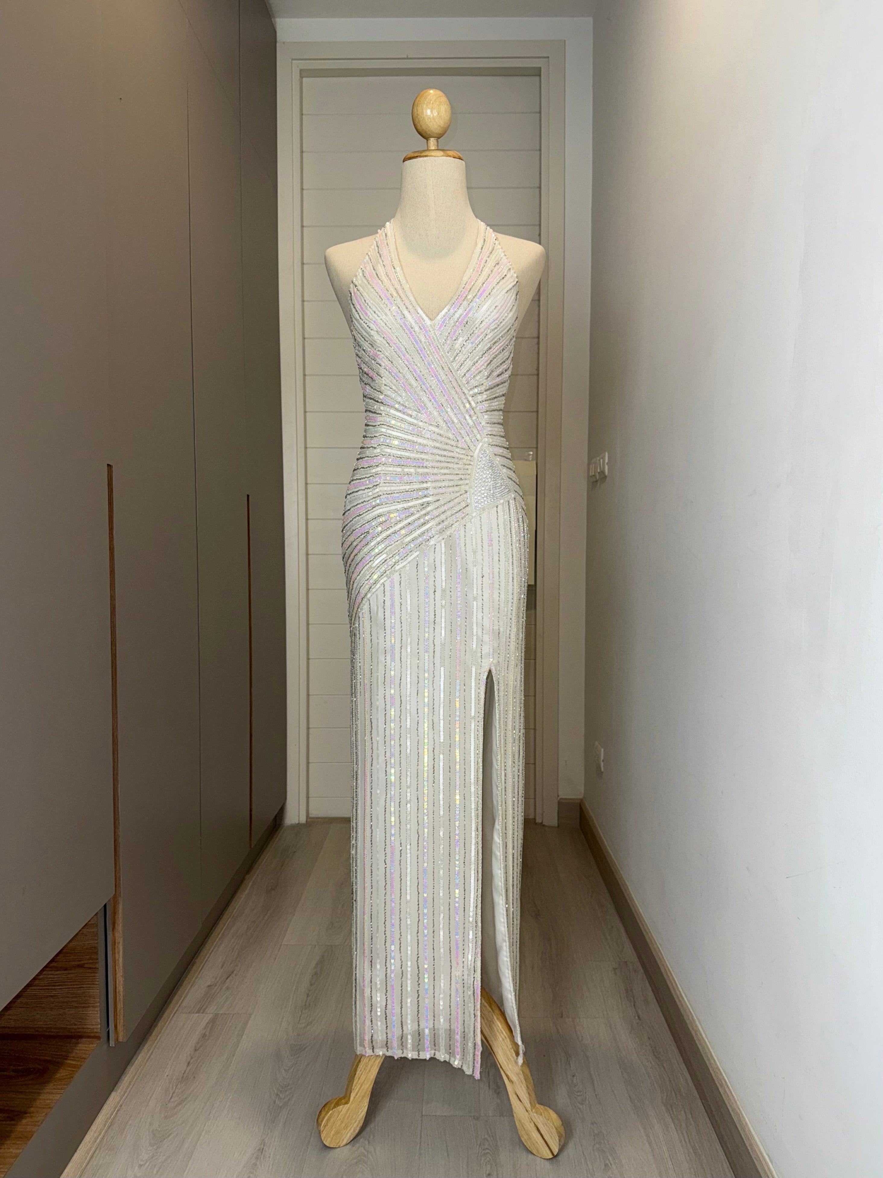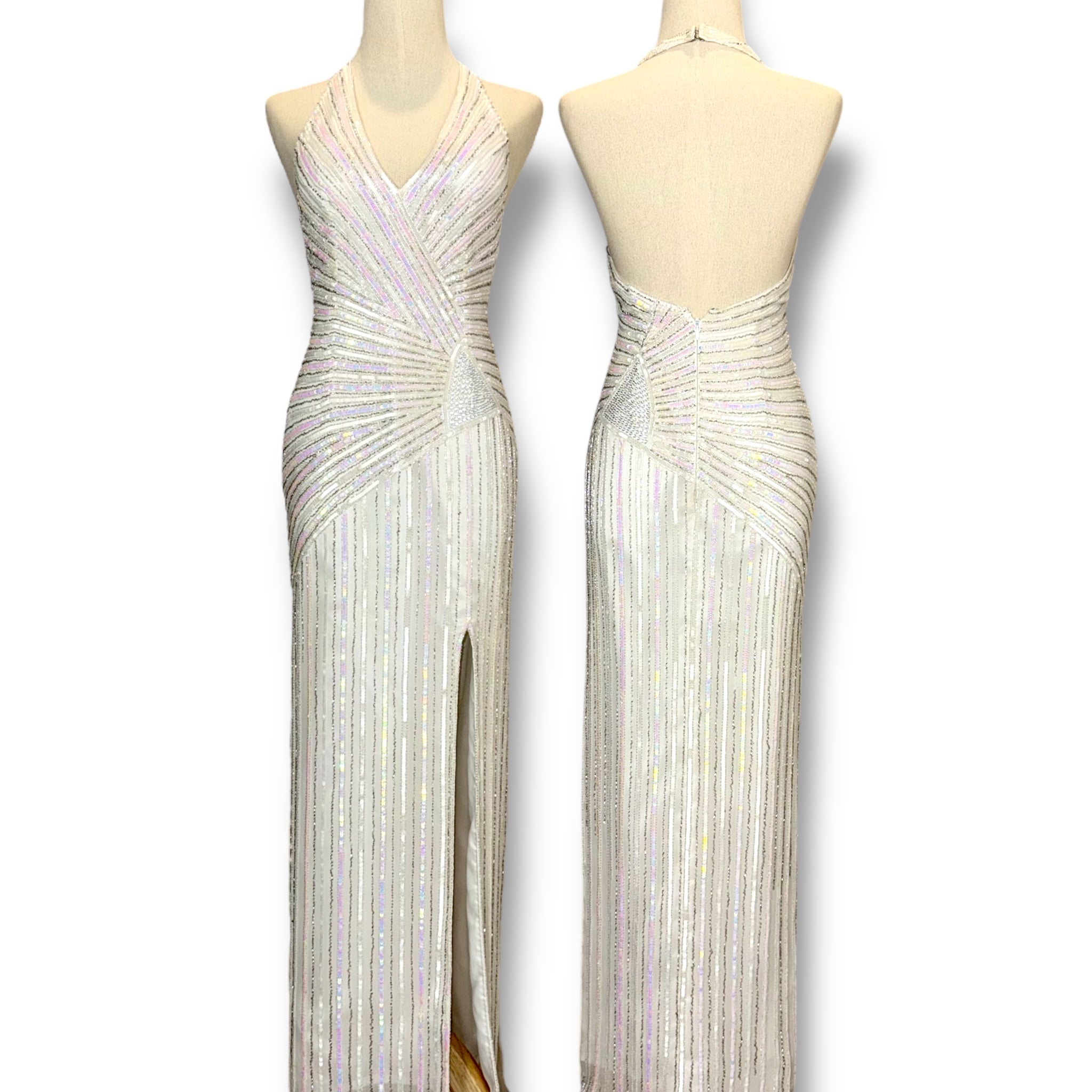 V134 Vintage Precious Formals Halter Gown – White Iridescent Beads (XS-S)
