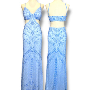เดรสวินเทจสีฟ้าอ่อน มาในดีไซน์สายเดี่ยวปรับได้ พร้อมดีไซน์เว้ากลางลำตัวที่เผยผิวอย่างมีระดับ เสริมสรีระให้ดูเพรียวสง่า ตัวชุดประดับลายปักลูกปัดและคริสตัลแน่นละเอียดทั่วทั้งตัว ด้วยลวดลายเรขาคณิตผสมพรรณพฤกษา ให้ความรู้สึกหรูหราแต่ยังคงความสดใส