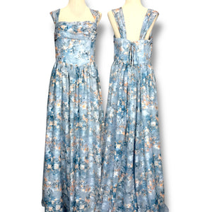 เดรสสายใหญ่ลายดอกไม้โทนฟ้าสบายตา ดีไซน์ช่วงอกจับเดรปเล็กๆ เพิ่มความละมุน พร้อมทรงเกาะใต้อกที่ช่วยพยุงทรงได้ดี ด้านหลังผูกไขว้แบบเปิดหลัง กระโปรงยาวทรงเอ พองเล็กน้อยด้วยการจับจีบจากรอบตัวเอว ใส่แล้วดูสง่างาม มีความหวานแบบผู้ดีอังกฤษ