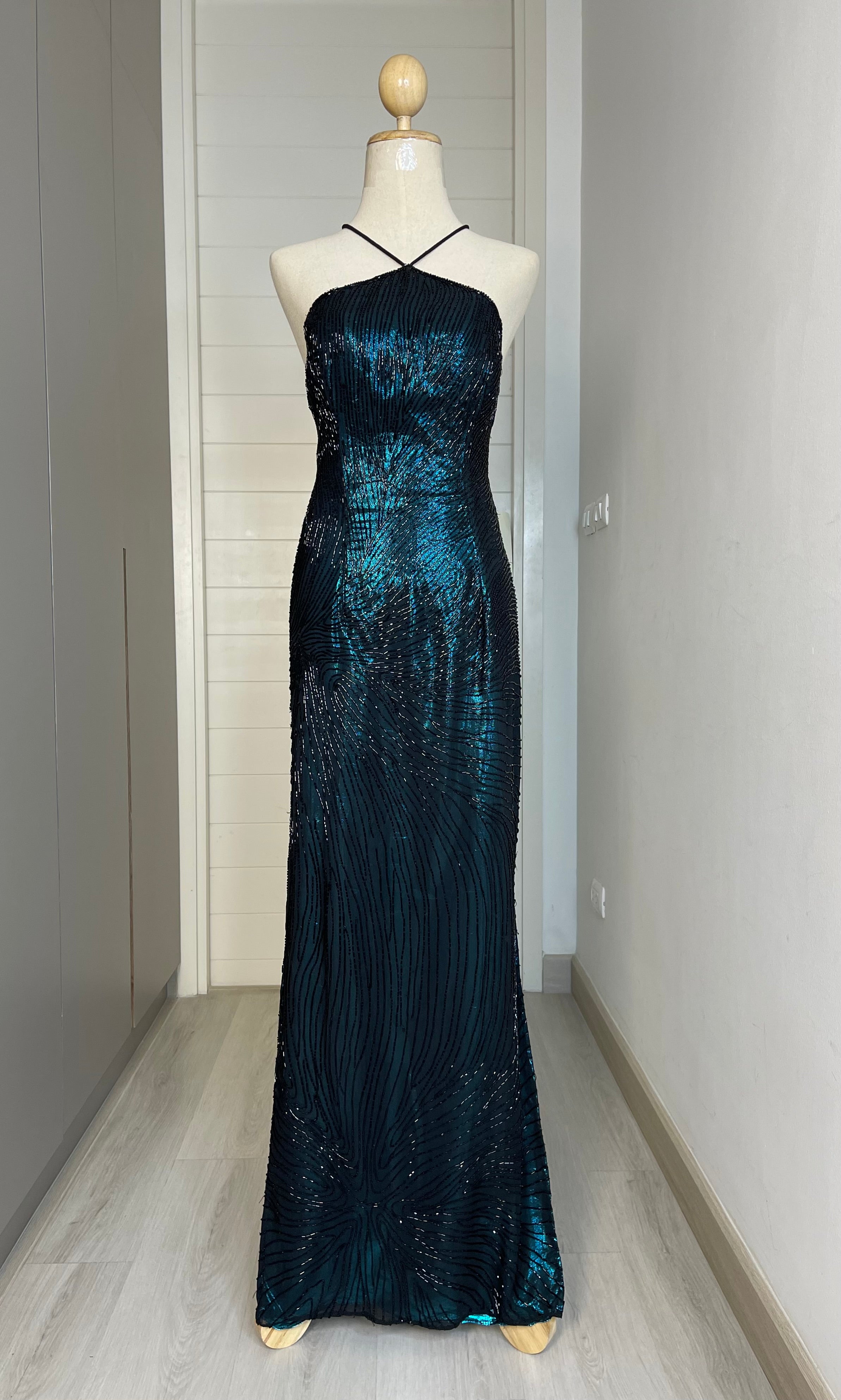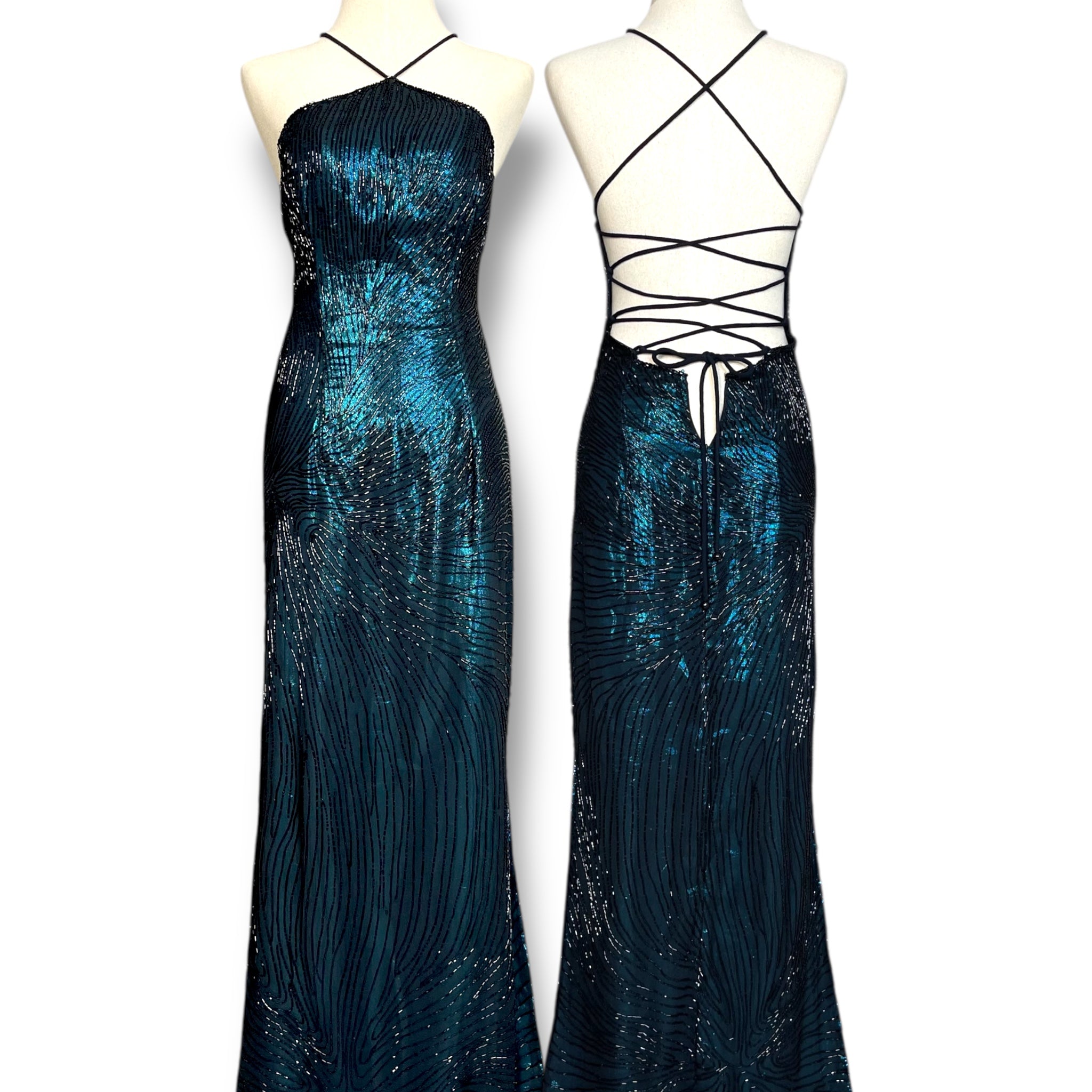 V149 Vintage Blue Bloom Sequin Halter Dress (M)