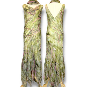 เดรสวินเทจโทนเขียวอ่อนปนชมพู ลายริ้วหวานละมุนชวนให้นึกถึงกลีบดอกไม้เคลื่อนไหวในสายลม ตัวชุดมีชายผ้าระบายด้านล่าง พร้อมผ้าคลุมไหล่เข้าชุด สวมใส่ได้ลื่นสบาย ดูโรแมนติกและโดดเด่น