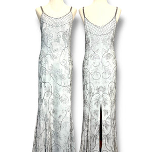 เดรสวินเทจออริจินอลจาก Caché ที่หายากมากในสภาพสวยแบบนี้ค่ะ ผลิตเมื่อปี 1990-2000s โทน เงินประกาย (silver/ice) ทรงสลิปสายเดี่ยวเรียบหรู แต่เด่นด้วยงานปักลูกปัดและเลื่อมลายเถาวัลย์ทั้งตัว พร้อมดีเทลช่วงอกแบบตาข่ายประดับบีดที่ให้มู้ดหรูคลาสสิก ใส่ออกงานแล้วดูแพงแบบมีเสน่ห์ เหมาะกับงานแต่ง งานกาล่า ดินเนอร์ หรืออีเวนต์กลางคืนที่อยากได้ลุคสะอาดแต่สะดุดตา