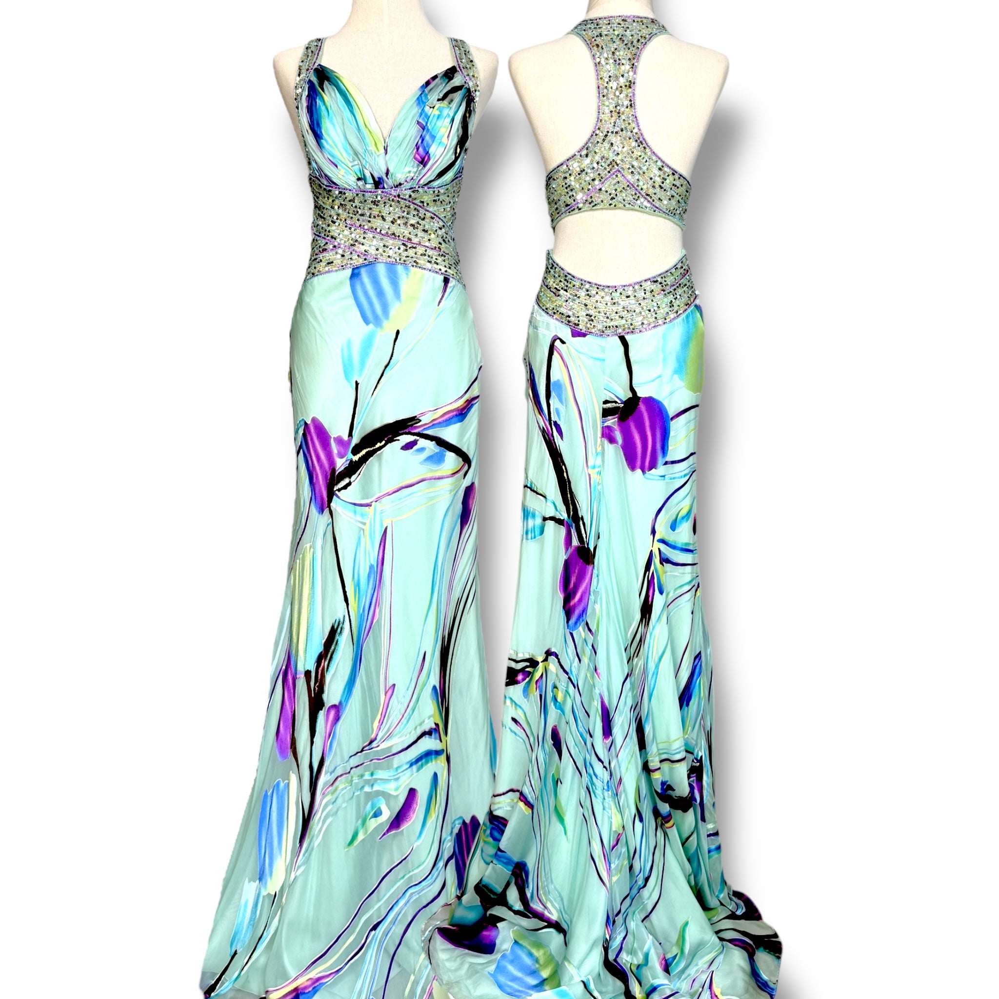 V82 Vintage Jovani Blue Floral Evening Gown (M)