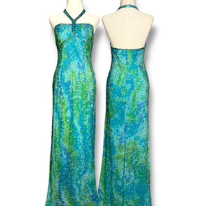 เดรสวินเทจออริจินอลสุดโดดเด่นในโทนสีเขียวฟ้า เปล่งประกายด้วยดีเทลเลื่อมทั่วทั้งตัวตัดกับดีไซน์คอฮอลเตอร์ที่โอบรับช่วงไหล่และลำคออย่างสง่างาม ตัวเดรสเข้ารูปช่วงเอวและสะโพกก่อนปล่อยชายกระโปรงบานพลิ้ว เหมาะกับทั้งงานกลางคืน งานพรมแดง หรืออีเวนต์พิเศษที่ต้องการลุคที่โดดเด่นไม่เหมือนใคร