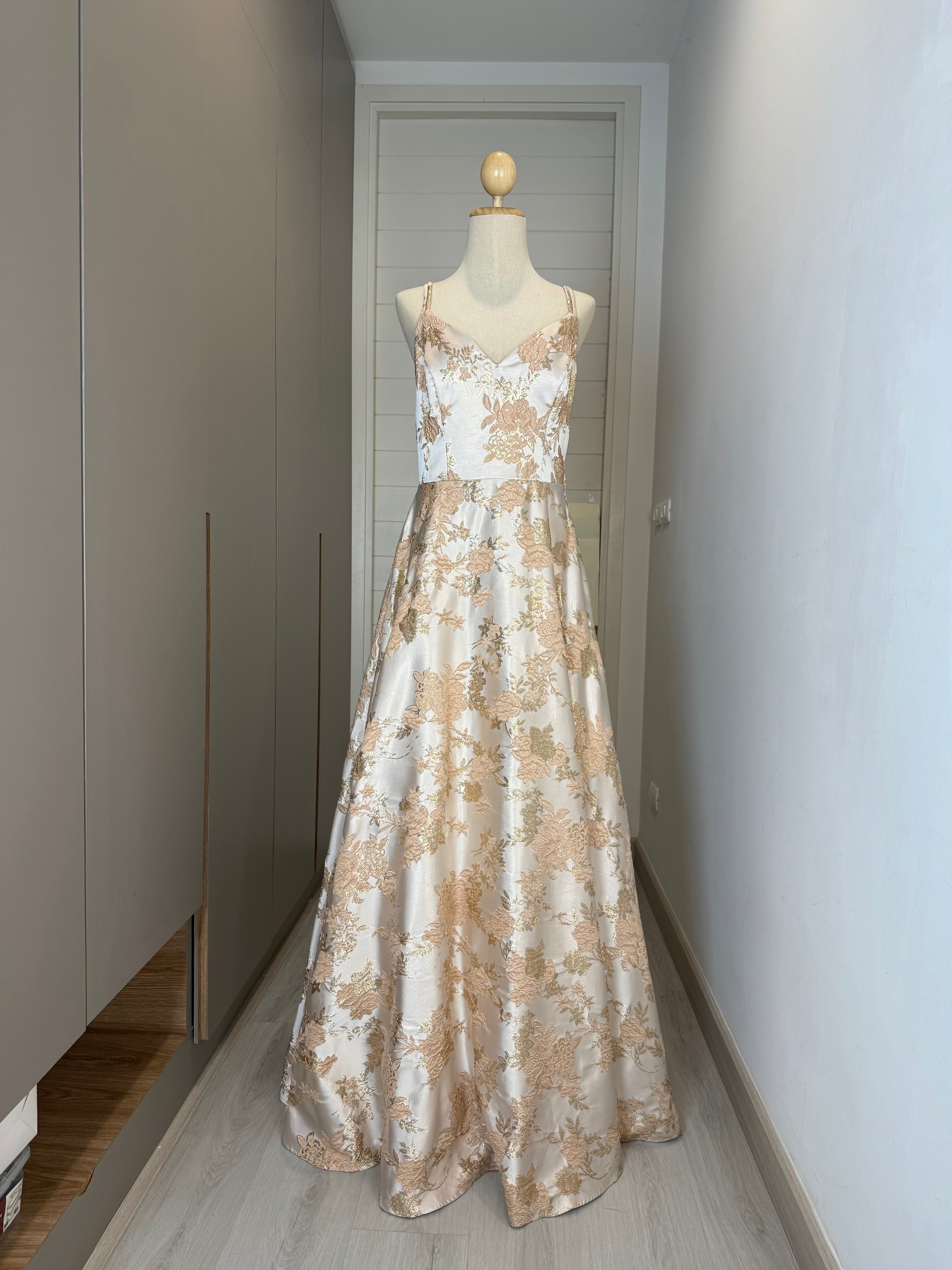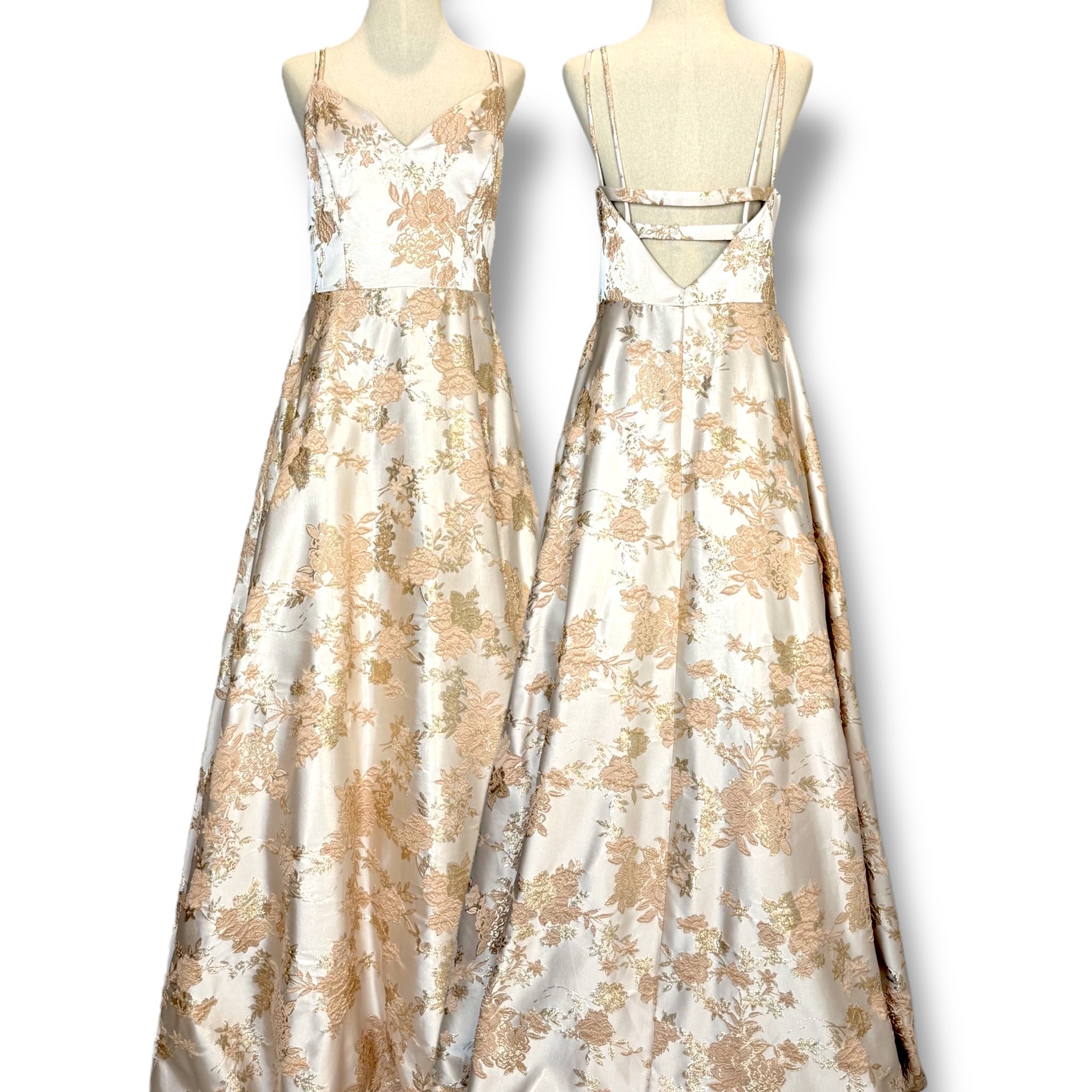 V190 Vintage Floral Champagne Satin Open-Back Dress (M)