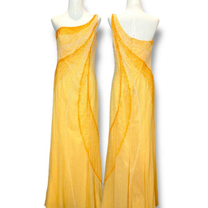 เดรสวินเทจไหล่เดี่ยวสีส้มอำพัน ดีไซน์ปักเลื่อมวิบวับทั่วทั้งตัว ไล่เฉดเป็นคลื่นแสงที่เคลื่อนไหวตามลำตัว โทนสีส้มทองให้ลุคเปล่งประกายเหมือนแสงไฟยามค่ำคืน โดดเด่นด้วยความพริ้วไหวของเนื้อผ้าและการตัดเย็บที่เน้นสัดส่วน เหมาะกับงานกลางคืนที่ต้องการลุคเฉิดฉายและหรูหรา