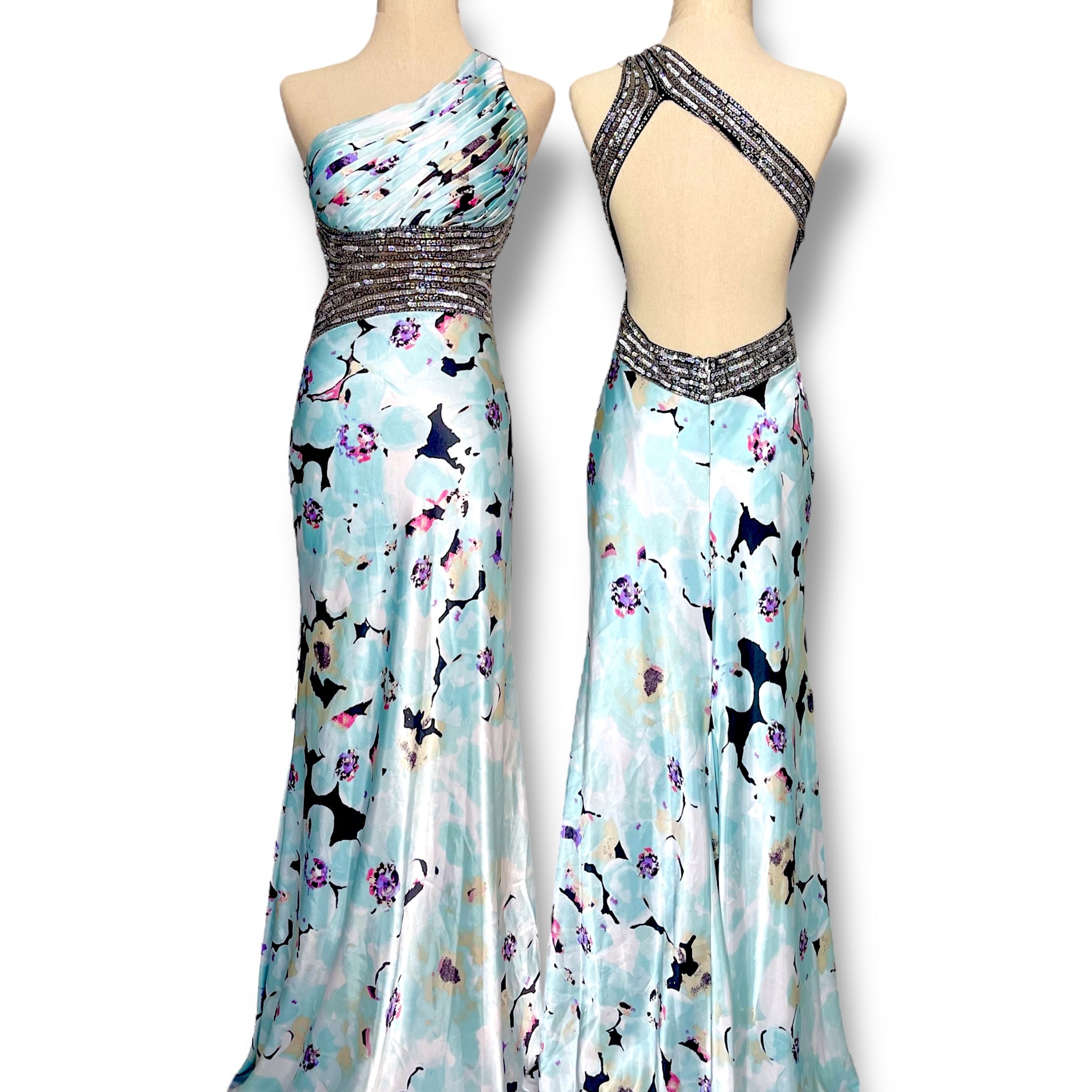 V47 Vintage Besty Blue Floral Evening Gown (XS)
