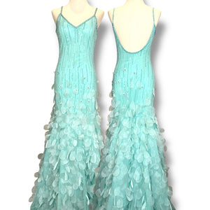 ชุดนี้มาในโทนสี Seafoam สวยละมุน เนื้อผ้าทรงตัวดีเยี่ยม ตกแต่งลายปักลูกปัดแนวตั้งตลอดตัว สร้างความเรียวยาวและสง่างาม ส่วนปลายกระโปรงไล่ระดับด้วยกลีบผ้าทรงกลมซ้อนทับอย่างพลิ้วไหว เสมือนเกล็ดของนางเงือกในเทพนิยาย