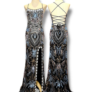 หนึ่งในเดรสที่สะกดทุกสายตาได้ทันทีตั้งแต่แรกเห็น—ชุดเดรสปักเลื่อมแน่นทั้งตัวจากแบรนด์ Primavera ในโทนสีดำขับลายปักสีฟ้าและโรสโกลด์อย่างมีมิติ เสริมลุควินเทจหรูหราเหนือกาลเวลา เหมาะกับทั้งงานกลางคืน งานกาล่า งานเดินพรมแดง หรือแม้แต่งานแต่งที่ต้องการความโดดเด่นแบบไม่ซ้ำใคร