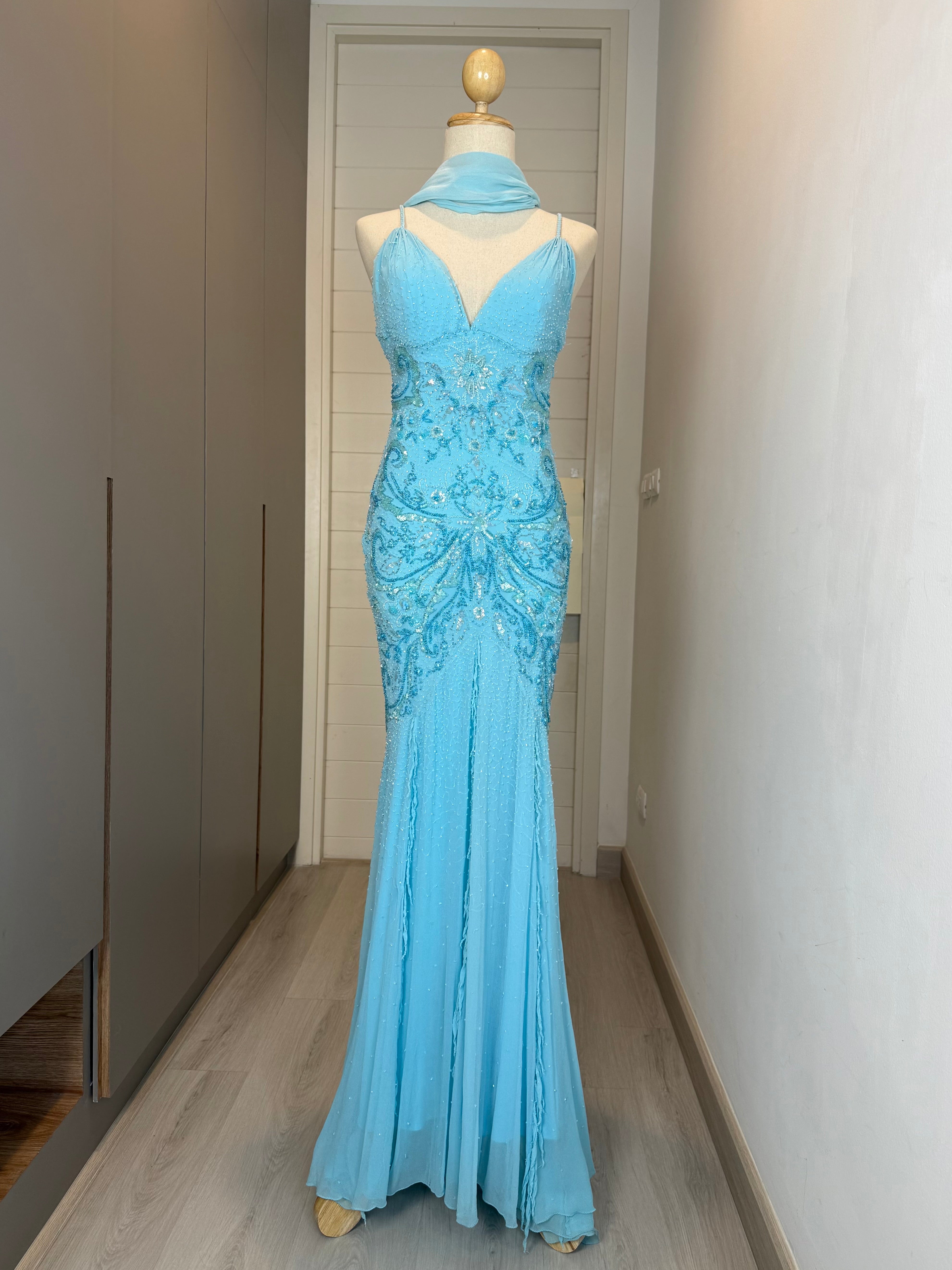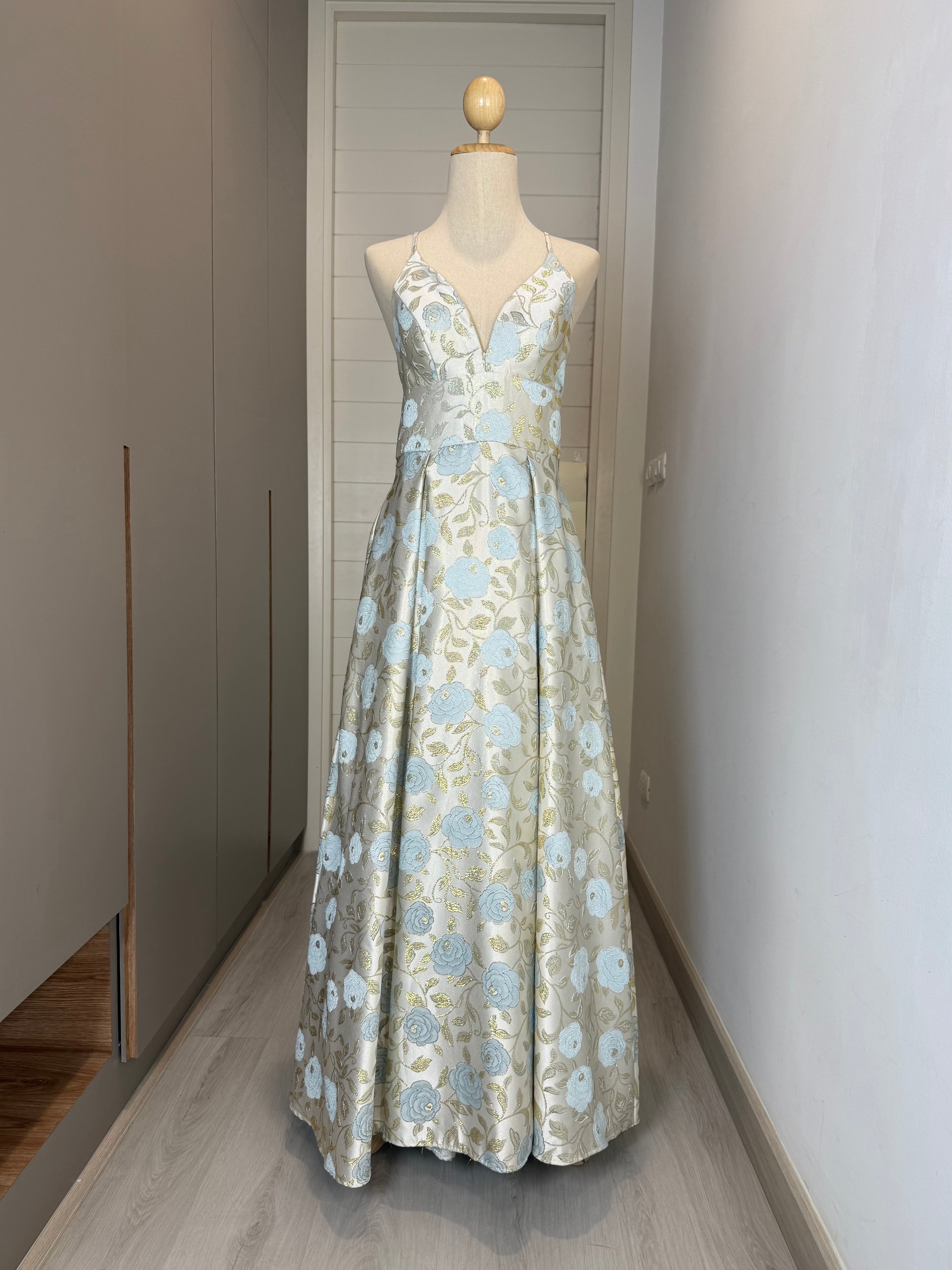 V191 Vintage Blue Bloom Embroidered Gown (XS)