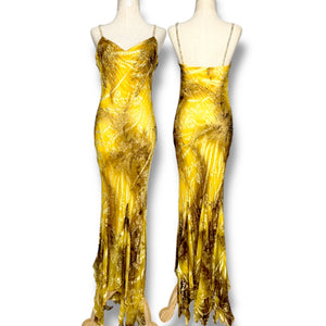 หรูหราโดดเด่นเกินต้าน! เดรสวินเทจแท้สุดหายาก ดีไซน์โทนสีเหลืองทองอร่าม ผสานลวดลายแบบ Abstract บนผ้า Silk เนื้อลื่นเงางาม เพิ่มมิติให้กับลุคอย่างมีระดับ ความพิเศษอยู่ที่ชายกระโปรง ดีไซน์เฉลียงไล่ระดับ ให้ความพลิ้วไหวและช่วยเสริมสรีระให้ดูสง่างามทุกมุมมอง